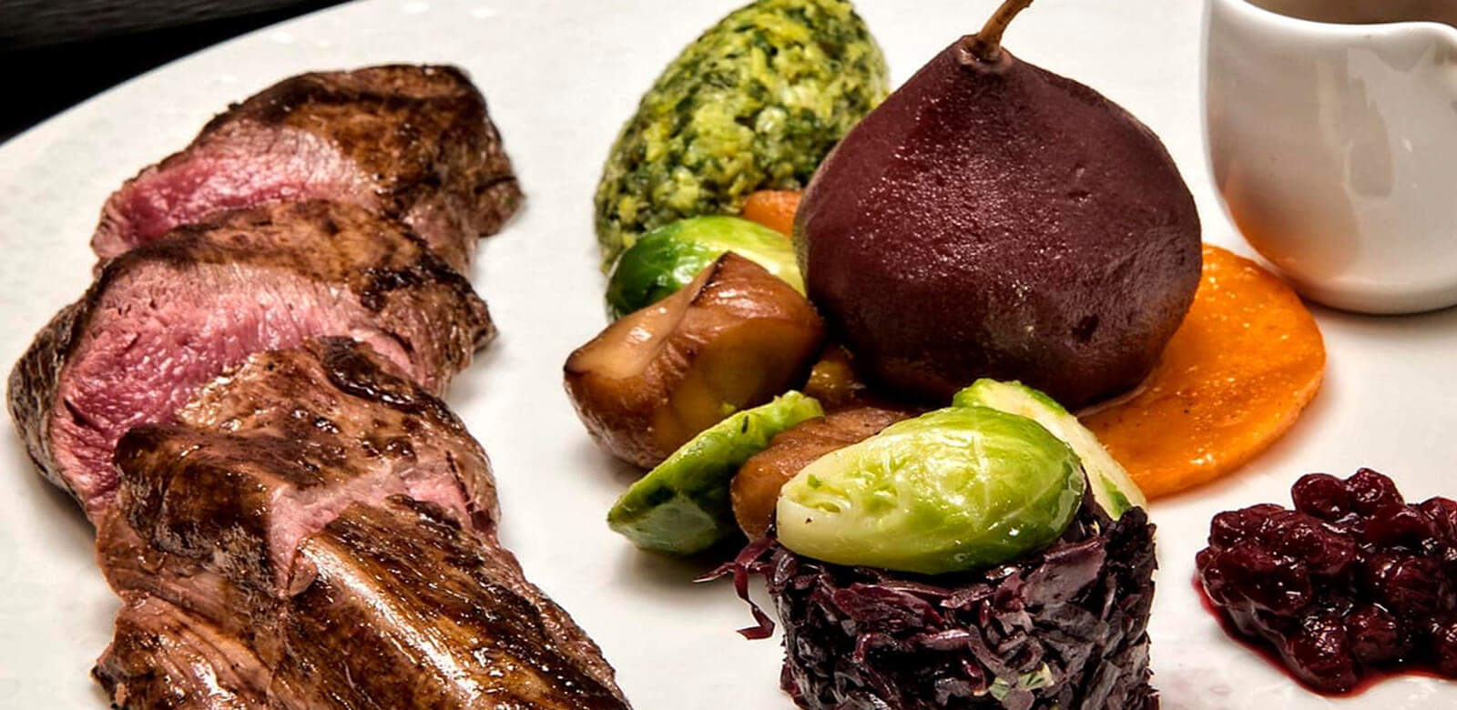 1) Jarret de Chevreuil braisé aux airelles, Crozets et potimarrons